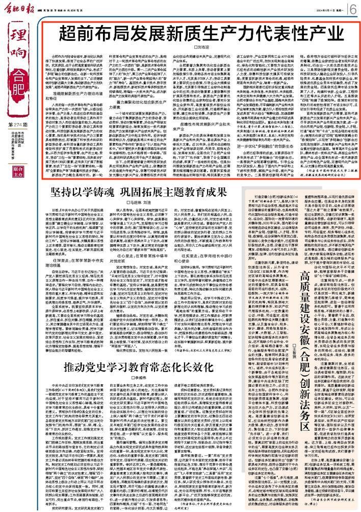 合肥作为内陆省会城市,新世纪以来获得了快速发展,得到了社会各界的广泛好评。究其原因,在于合肥高度重视科研成果转化,注重创新,积极发展新兴产业,形成了“多链”融合的创新生态。在新一轮科技革命和产业变革深入发展的当下,“必须继续做好创新这篇大文章,推动新质生产力加快发展”,超前布局新质生产力代表性产业。