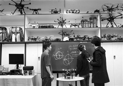 在上海交通大学机器人研究所的无人系统实验室,学生在进行讨论。新华社记者 刘颖 摄