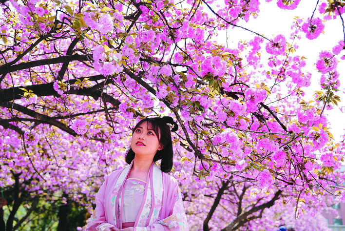一年一季,樱花绽放,如约而至。4月1日,记者走进中国科大,百米樱花大道的樱花已全面盛放,烂漫而美丽。来往的师生在此驻足,沉浸粉色樱花海洋,和春天撞个满怀。目前中国科大五个校区共有晚樱约250株,今年晚樱花期大概在清明节之后结束。图为身穿汉服的学生在樱花树下赏樱。