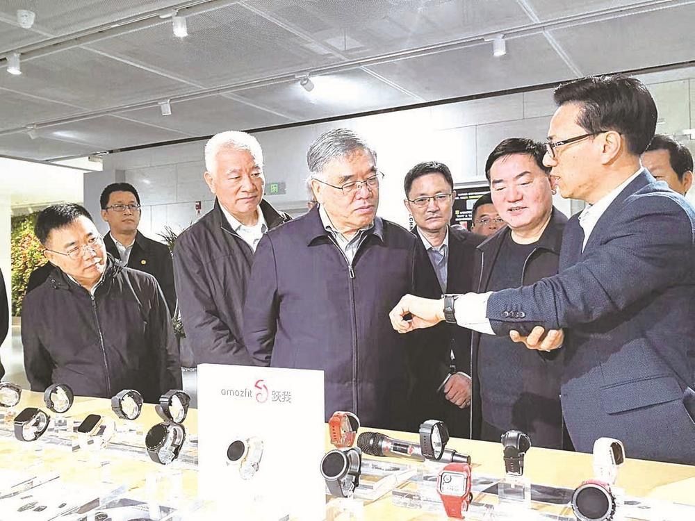 调研组在华米信息科技有限公司了解智能穿戴产品技术,并听取企业介绍发展情况。