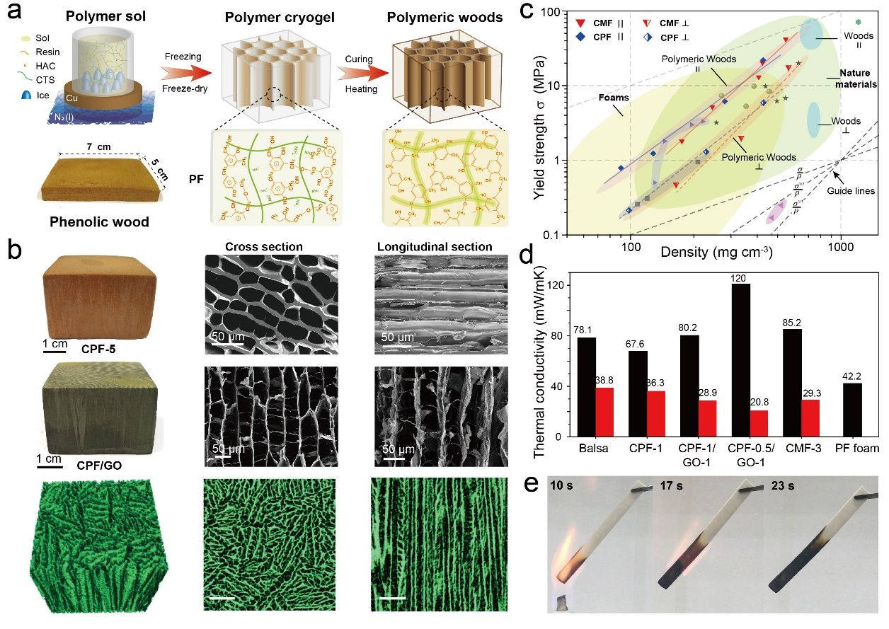 该团队还开展了基于酚醛树脂复合材料的宏观尺度材料的系统性研究,成功制备了具有轻质、多孔特性的酚醛气凝胶及其衍生气凝胶,优异的热绝缘和耐火能力使其在众多领域具有应用价值。受天然木材启发,研究团队制成了既有力学性能,又具备高耐腐蚀性和隔热防火功能性的复合材料,为建筑、新能源汽车和航空航天等领域提供了新的材料选择。