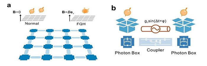 成果示意图。16个非线性“光子盒”阵列囚禁的微波光子强相互作用形成分数量子反常霍尔态