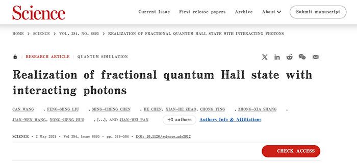 日前,中国科学技术大学潘建伟、陆朝阳、陈明城等科研人员,通过自研的新型量子模拟器,构建出光子的反常分数量子霍尔态。这是一种奇异的由粒子之间强相互作用形成的量子流体,在这里,光呈现出了“液态”。形象点说,就是光子不仅各自独舞,还能绕着其他光子群舞。相关科研成果以长文的形式发表在国际学术期刊《科学》上。