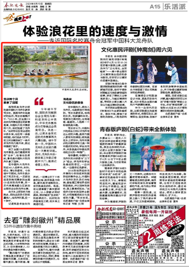 今年端午节前,国际皮划艇联合会主席托马斯·科涅茨科公开表示,中华龙舟赛将成为巴黎奥运会表演项目。消息一出,让原本备受欢迎的龙舟赛事再次火爆出圈。端午节前一天,中国科大龙舟队还在进行最后一次赛前训练。其间,龙舟队向乐·皖体育工作室记者敞开大门,邀请记者登上龙舟。