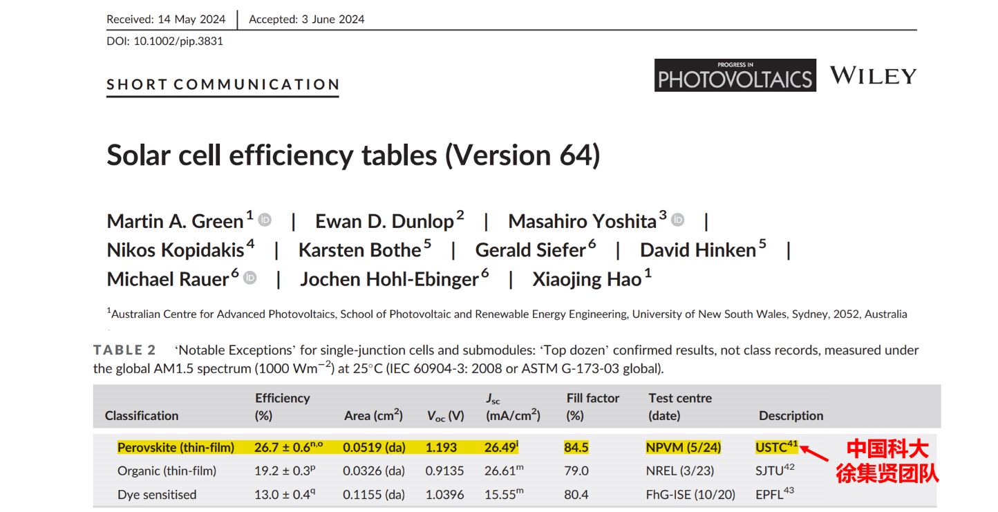 近日,中国科学技术大学教授徐集贤团队在钙钛矿太阳电池方面获得重要进展,创造了钙钛矿电池稳态效率的认证世界纪录26.7%,被国际权威的世界纪录榜--太阳能电池效率表《Solar celle fficiency tables》(Version64)收录,并于7月3日发布。