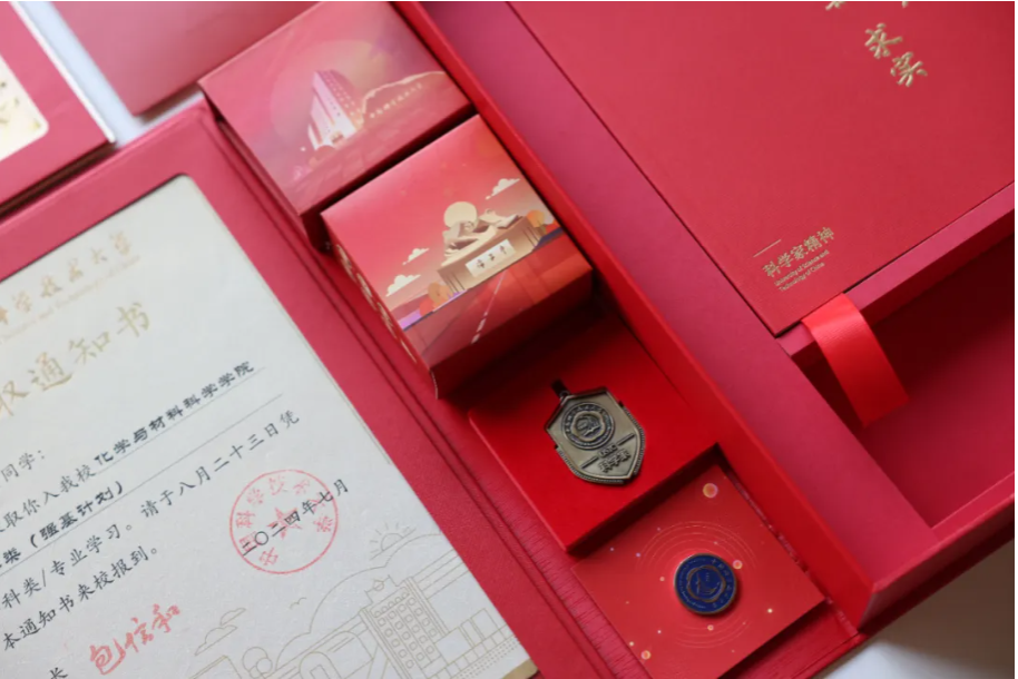 其中育才奖章意由学生送给恩师,“科学家”奖章意由孩子送给父母,感谢他们的多年的悉心培养。小牛偶礼盒也是随机附送在礼盒内,中国科大共设计了6款精致的科大专属小牛偶和限定神秘隐藏版,学生们收到录取通知书时,还能体验拆盲盒。