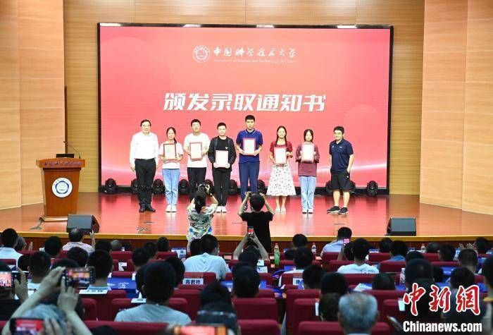 7月19日,在中国科学技术大学水上报告厅,73位本科新生代表领取了2024年首批本科录取通知书,部分新生代表的父母和中学老师也受邀到校园见证。后续该校将有近2000封本科录取通知书发往全国各地。图为录取通知书颁发仪式现场。