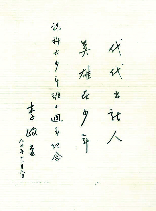 中国科大少年班的创办在当时引起极大轰动,受到全国人民的广泛关注与支持,也激励了一代青少年尊重知识、崇尚科学、努力学习。为了办好少年班,中国科大不断总结经验,开始了一系列教育试验,对少年大学生的成长规律和教育教学规律进行研究,不断将成功经验推广至普通本科生培养中。少年班的办学也受到了各级领导和国内外教育家、科学家的充分支持和肯定,更是成为合肥人才培养的响亮名片。1987年12月,为纪念少年班成立10周年,李政道为少年班题词:“代代出新人,英雄在少年”;2023年,时值中国科大少年班成立45周年,李政道先生第四次亲笔题词:“庆贺科大少年班45周年”,表达了他对于少年班的无限期待。