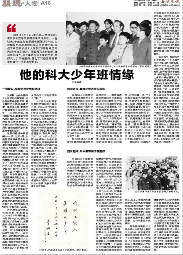 2024年8月5日,著名华人物理学家、诺贝尔物理学奖获得者李政道逝世。一直以来,李政道与合肥颇有渊源,50年前,由他撰写的培养基础科学人才的建议书,促成了中国科学技术大学(以下简称中国科大)少年班的创办。他曾两次来到合肥,造访中国科大,与少年班的师生亲切交流,并四次为少年班题词,蕴含了对祖国教育事业和青年一代的殷殷期盼。