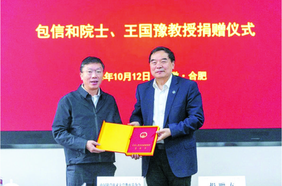 院士接棒,薪火相传。10月12日,中国科大新任校长常进院士走进本科生课堂,承诺努力做好同学们的“勤务兵”。同一天,刚卸任中国科大校长职位的包信和院士,偕夫人王国豫教授向中国科大进行捐赠,在学校设立“双碳基金”,专项支持中国科大碳中和领域科学研究与人才培养。