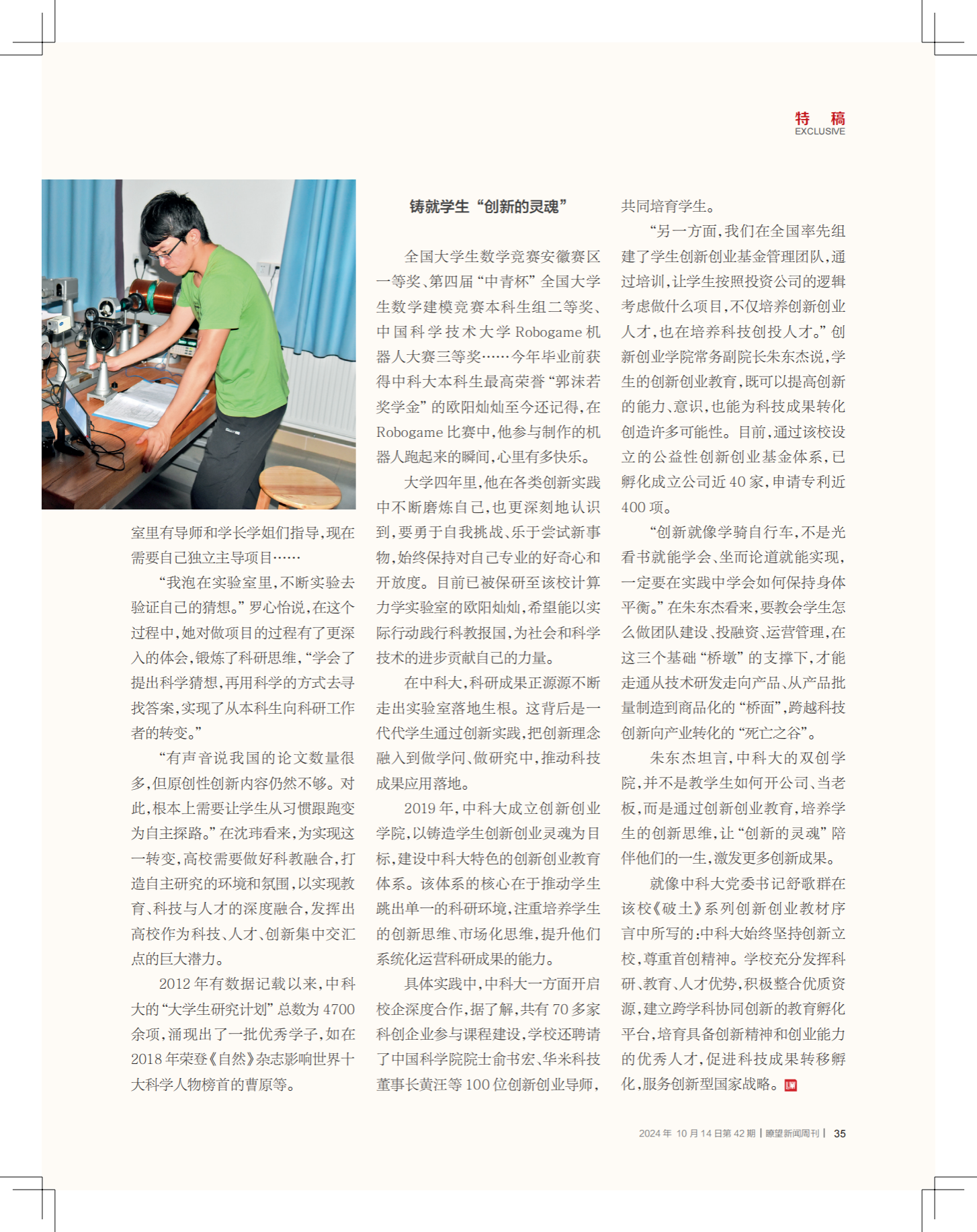 在很多人印象中,大学本科在高等教育中处于打基础阶段。但《瞭望》新闻周刊记者近期在中国科学技术大学采访了解到,这所高校将人才培养端口前移,着力培育本科生创新精神、科研能力,探索更好实现教育、科技、人才“三位一体”的道路,志在尽早为国家遴选、孕育优秀尖端科技人才。