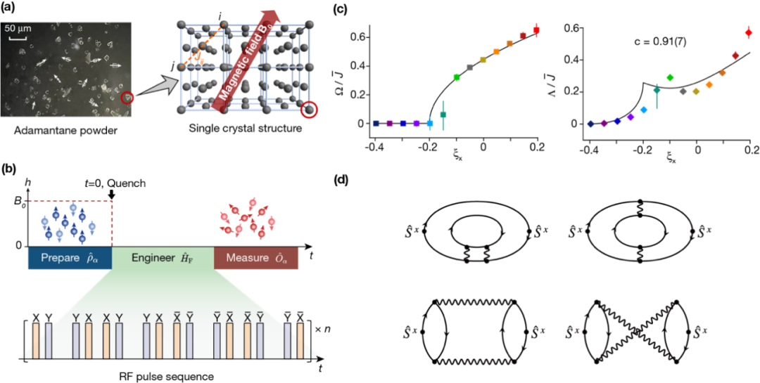 固态核自旋体系是天然的复杂多体量子体系,通过量子调控技术能够对核自旋体系进行精确控制,从而实现不同的自旋多体模型,这为研究量子多体系统的非平衡动力学提供了自然的、可调控的实验平台。基于团队多年对核自旋体系量子控制与量子模拟方面的技术积累,研究组通过精心设计高精度的磁共振脉冲序列(如图b),对金刚烷粉末的固态核自旋体系(单个晶粒包含109至1012个核自旋,如图a)进行高精度量子控制,利用粉末样品中单个晶粒的晶轴随机性,实验实现了一个相互作用各向异性强度可调的随机相互作用自旋模型。通过调节各向异性强度,清晰观测到该模型中的自旋退极化弛豫动力学过程从单调衰减到振荡衰减的转变现象,这是在以往的实验中未曾观察到的新现象。研究组和清华大学翟荟教授团队、复旦大学张鹏飞教授等理论合作者密切合作,通过小尺度严格数值对角化、半经典近似和非平衡场论方法等多种理论方法和实验交叉验证,成功揭示了实验现象背后主导的非平衡动力学普适性——即随机相互作用自旋模型中自旋退极化弛豫动力学可以被两个参数普适地描述(如图c)。这一普适性揭示出主导自旋弛豫动力学的相互作用过程,而这些相互作用过程的贡献恰好可以用两个简单参数描述(如图d)。