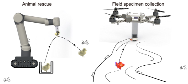 “我们将远程抓手安装在无人机上,通过遥控器来控制抓手抓取水中的小鱼,实现了小鱼的快速抓取和远程转移。”李木军介绍,这个操作未来可以在野外生物样本收集中发挥更加重要作用,比如,需要研究某个海里的鱼类或草原上的小动物,可以通过抓手进行无伤捕获。