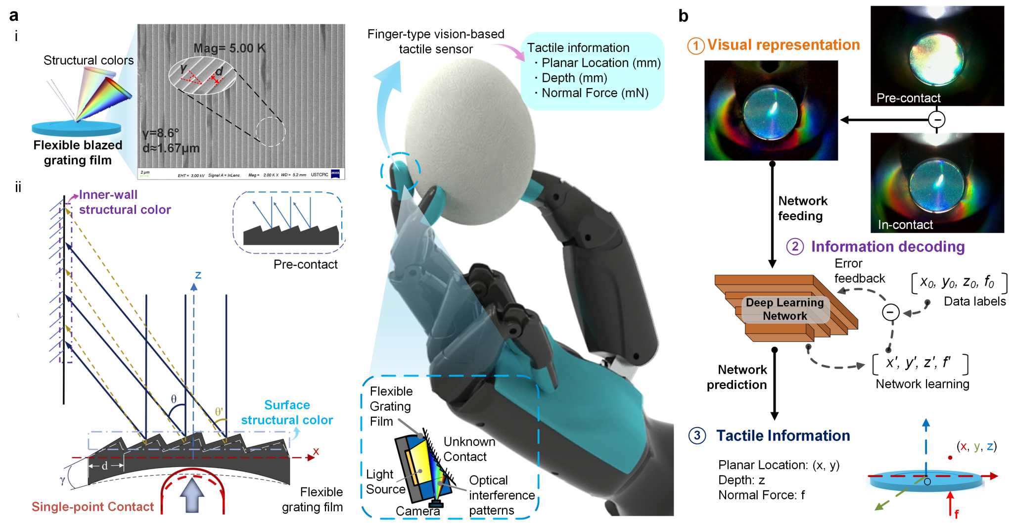 针对这一难题,研究团队受仿生结构色现象的启发,创新性地采用柔性光栅薄膜在白光照射下形成的结构色图案作为触觉表征信息,并结合深度学习算法进行数据处理,实现了接触点的高灵敏、高分辨率感知。
