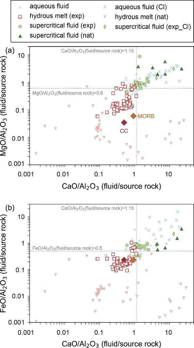 该研究首先从相图层面明确了超临界流体的概念,然后从多相包裹体(图1)、特殊的元素迁移、超临界流体的相分离效应和同位素分馏等方面详细阐述了天然样品中超临界流体活动的记录。最后,本研究提出了4个方面的识别超临界流体活动的标准。包括(1)盐类子矿物是富水流体包裹体的识别指标,对碳酸盐、硫化物/硫酸盐、磷酸盐和氧化物这4类子矿物,代表含水熔体的包裹体中这些子矿物的种类数≤2,而代表超临界流体的包裹体中这些子矿物的种类数≥2(图1);(2)计算获取的超临界流体相比源岩的元素富集系数具有CaO/Al2O3≥1.15、FeO/Al2O3≥0.5和MgO/ Al2O3≥0.6的特征,而含水熔体则小于上述临界值(图2);(3)微量元素特征,从超临界流体中结晶的金红石往往具有较低的Nb含量,此外,在Log[Ta]-Log[Nb]图中,超临界流体交代后的榴辉岩成分与由玄武岩成分确定的线性拟合线之间的距离大于0.1;(4)超临界流体的Fe同位素组成(0.9-1.1‰)远高于其它流体(<0.4‰)。