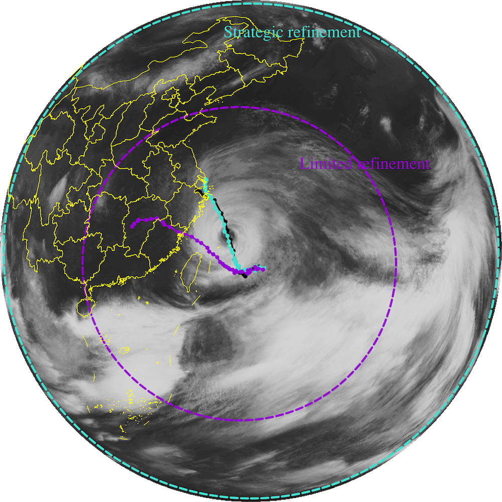 研究团队进一步开发了一种创新的可变网格细化策略,通过针对影响台风运动的关键天气系统,在计算需求与精度之间实现了平衡。与全球对流解析模型相比,这种方法在保持相近精度的同时,计算成本降低了90%以上,并扩展应用于历史上其他10个台风案例轨迹预测中,取得显著的改进效果。