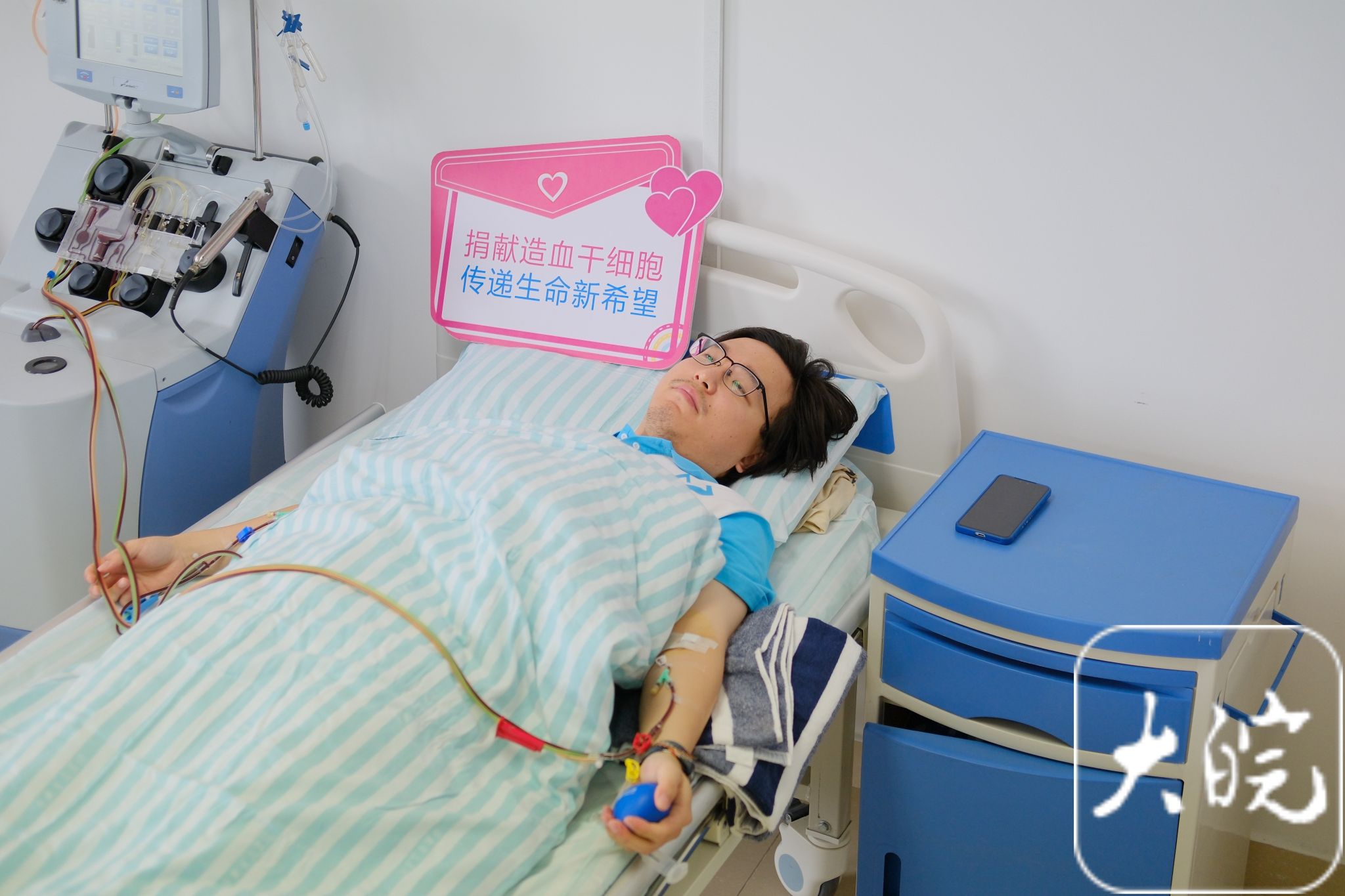 大皖新闻讯  6月24日上午,在中国科学技术大学附属第一医院造血干细胞移植二病区采集室内,安徽省第771例造血干细胞捐献者李宁正有规律地捏着手中的握力球。通过床边的血细胞分离机,他的造血干细胞正从血液中分离出来,其余的血液则回输进体内。很快,他的造血干细胞将为一位素昧平生的患者带去新生。