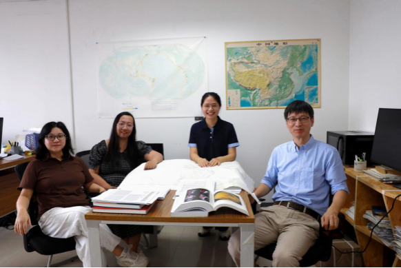 中国科大教授孙道远(左一)与团队成员讨论研究进展