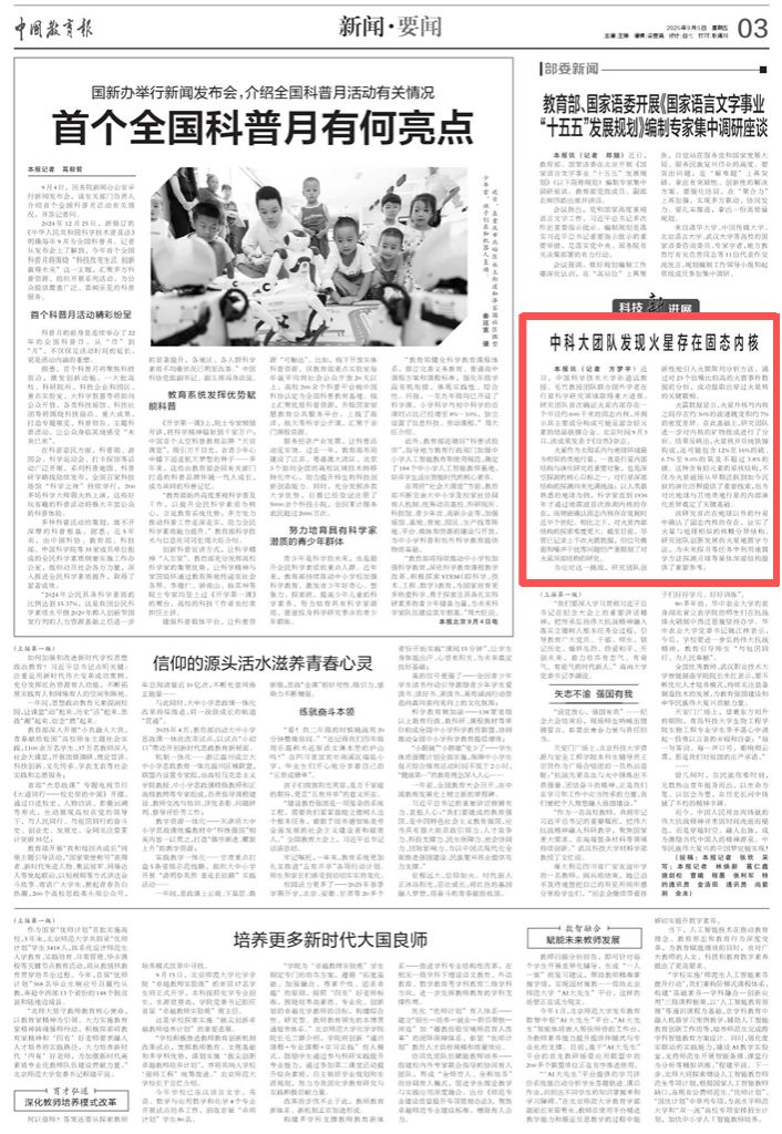 该研究首次在地球以外的行星中确认了固态内核的存在,证实了火星与地球相似的核幔分异结构。研究团队创新发展的火星地震学方法,为未来探月等任务中利用地震学方法探测月球等星体深部结构提供了重要参考。